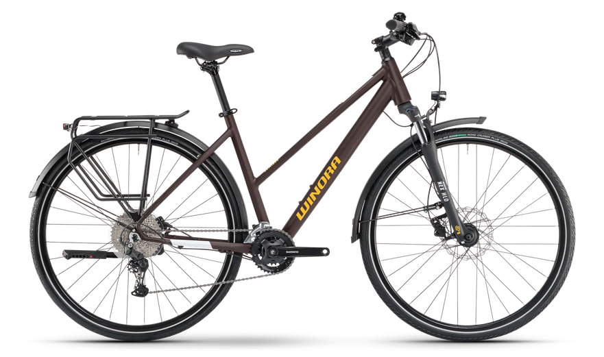 Schnell, leicht und vielseitig. Das Winora Domingo X20 ist ein sportliches Tourenrad, das dich auf kurze Ausflüge genauso verlässlich mitnimmt wie auf lange Abenteuer. Dabei ist dieses leichte Trekkingbike perfekt für alle, die viel von ihrem Fahrrad verlangen. Die 28-Zoll-Reifen rollen problemlos über die meisten Untergründe, während die SR Suntour Federgabel mit 63 mm Federweg gekonnt die Vibrationen von Kopfsteinpflaster, Schotterstrecken und Co abdämpft. Dank der Schutzbleche und der starken Scheibenbremsen sind aber auch Regenfahrten kein Problem, sodass das Domingo X20 auch ein idealer Begleiter für all diejenigen ist, die ein Rad suchen, das sie zuverlässig in die Arbeit und wieder nach Hause bringt. Praktisch: Auf dem Gepäckträger findet vieles Platz – von der Aktentasche bis zum Tourengepäck.